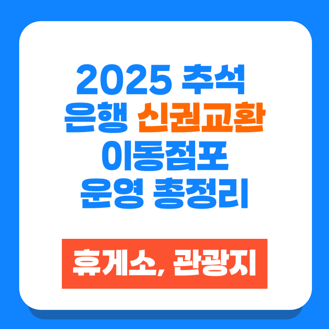 추석 명절이 다가오면 현금이 필요하거나 신권 교환을 하고 싶은 경우가 많습니다. 하지만 대부분의 은행이 휴무이기 때문에 불편을 겪는 분들이 많죠. 다행히 올해는 주요 은행들이 고속도로 휴게소, 기차역, 관광지 등에서 이동점포를 운영합니다. 신권 교환뿐 아니라 ATM 인출, 계좌이체, 통장정리까지 가능해 귀성객들에게 유용할 전망입니다. 이번 글에서는 2025년 추석 연휴 은행 ATM·이동점포 운영 현황을 정리해드립니다.